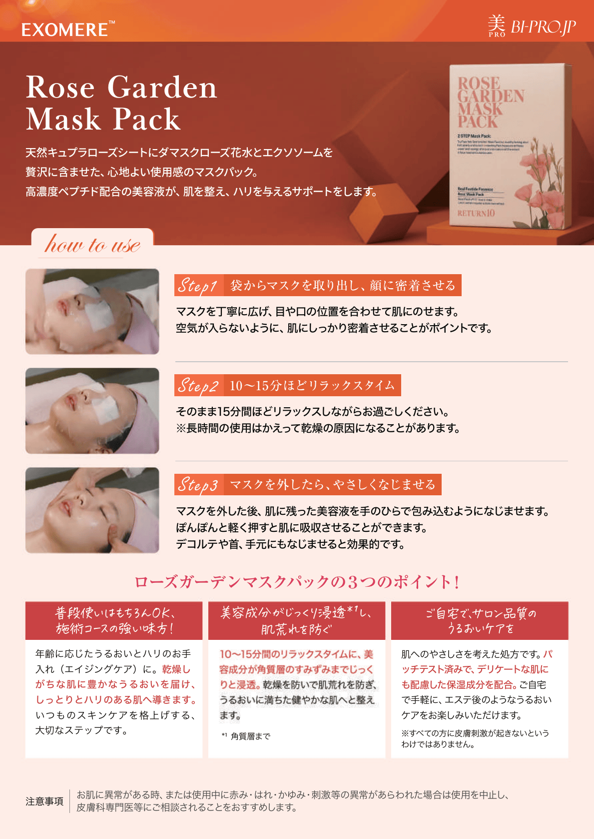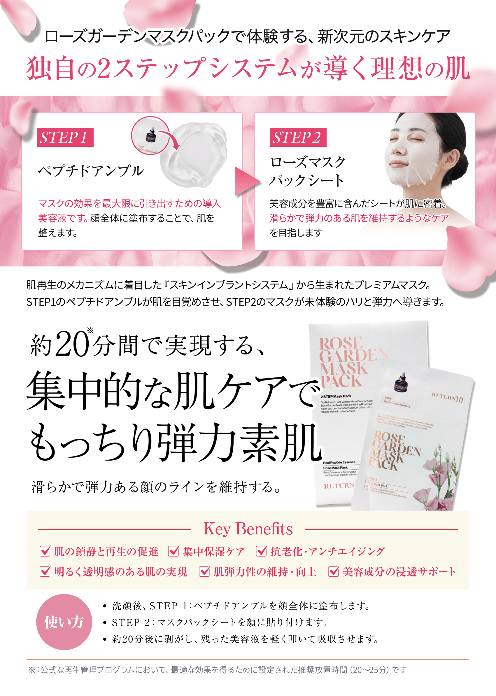 After washing your face, apply the rose sheet mask in Step 1 to your face and leave it on for 10 to 15 minutes.
