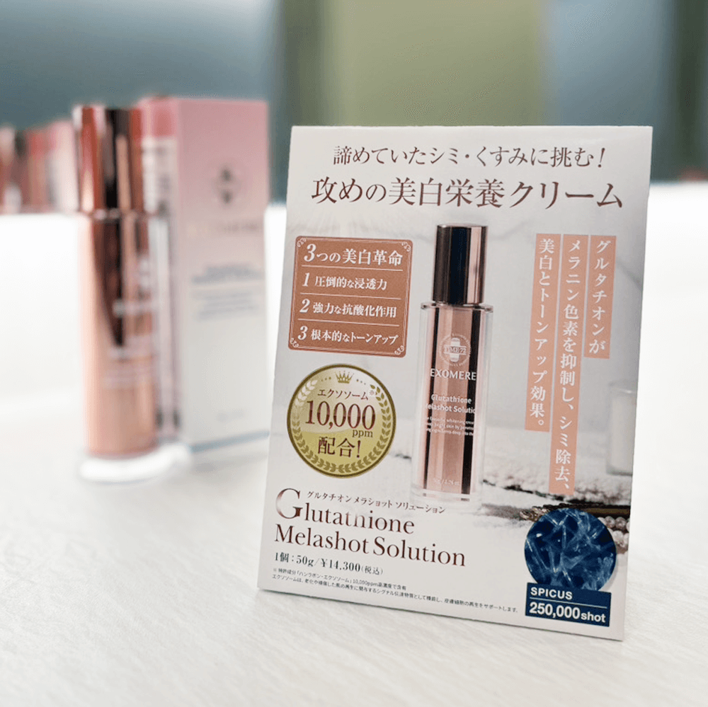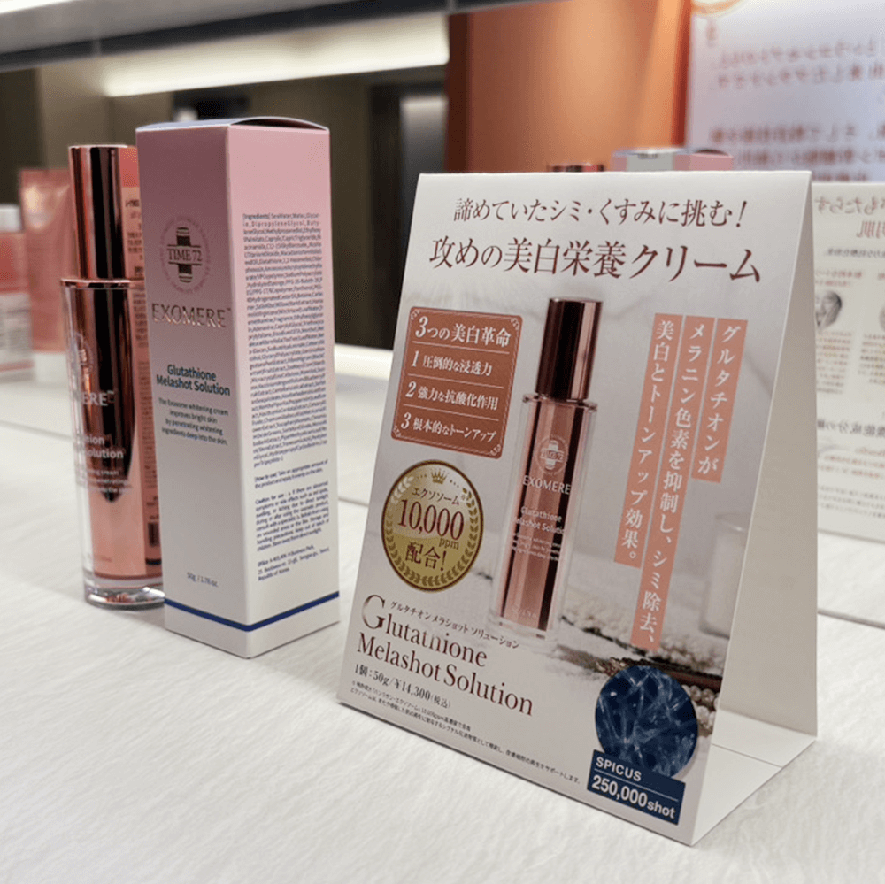 EXOMEREグルタチオンメラショットソリューションの物販販促強化に役立つ店内卓上POPです。